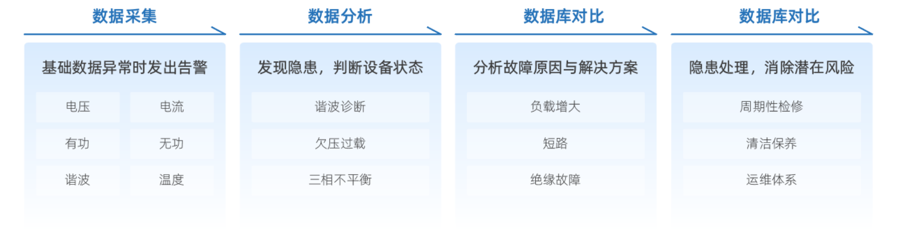 智慧供配電系統以站內設備作為監管對象,布置智能監測終端采集設備運行數據及周邊環(huán)境安全因素,電氣設備運行狀態(tài)的動(dòng)態(tài)感知和準確預警。從輸電→配電→用電各環(huán)節,通過(guò)智能化管理,對用電安全進(jìn)行數據化檢測,并通過(guò)智慧運維實(shí)現最終的經(jīng)濟效益。
